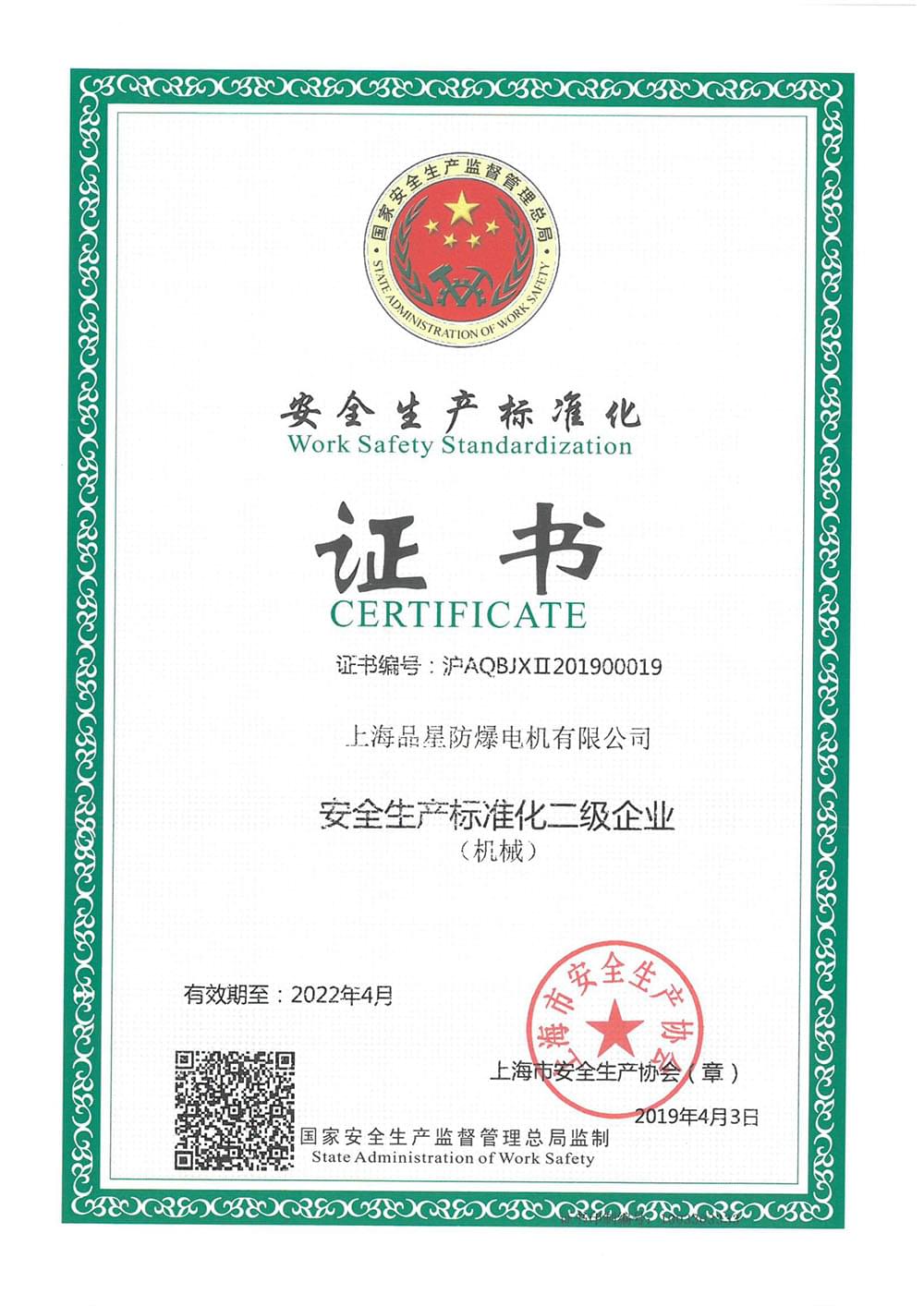 上海品星防爆電機(jī)有限公司安全生產(chǎn)標(biāo)準(zhǔn)化證書(shū)。